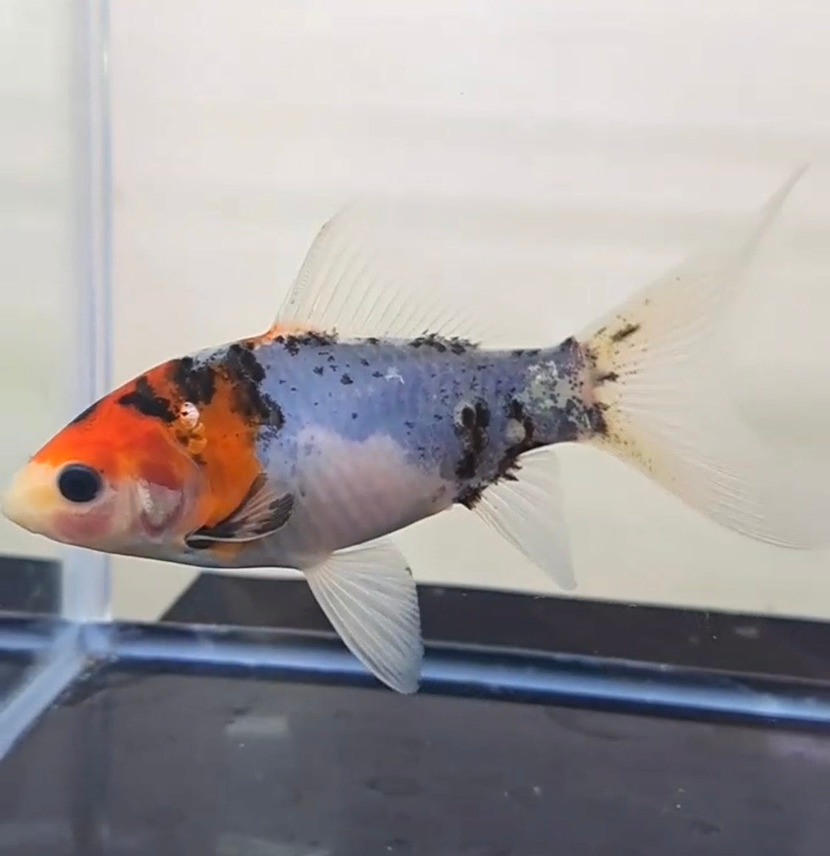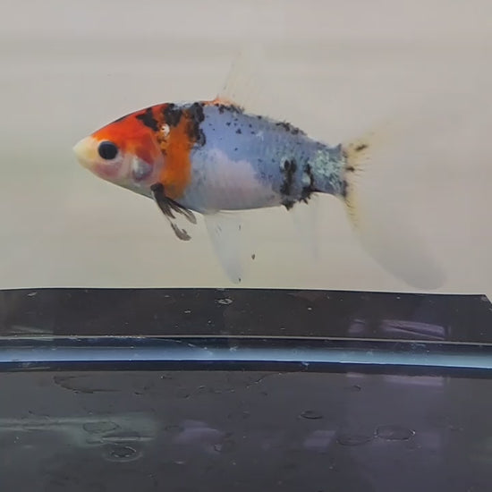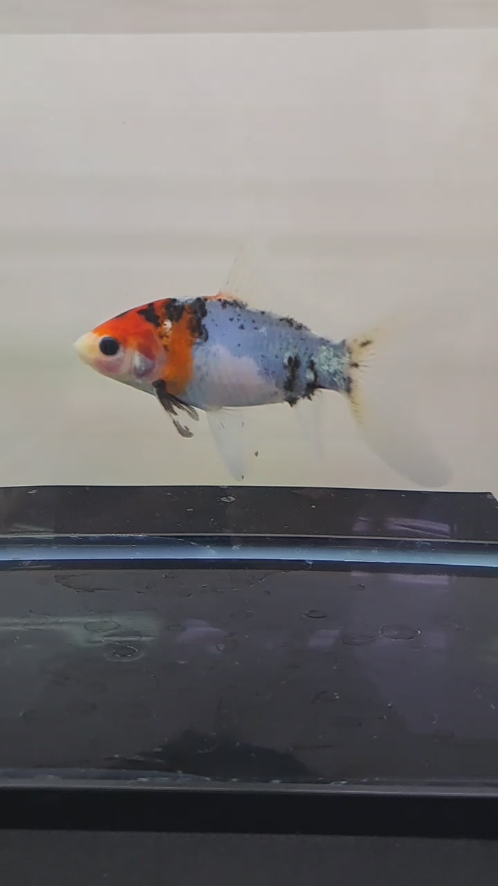 鮮やかな朱と青の模様が美しい朱文金です。健康で活発な個体で、水槽や池を華やかに彩ります。